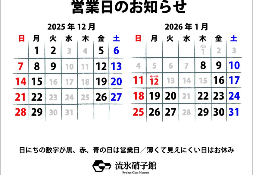 営業日とガラス制作体験の受け入れの可否は必ずしも一致しませんので、