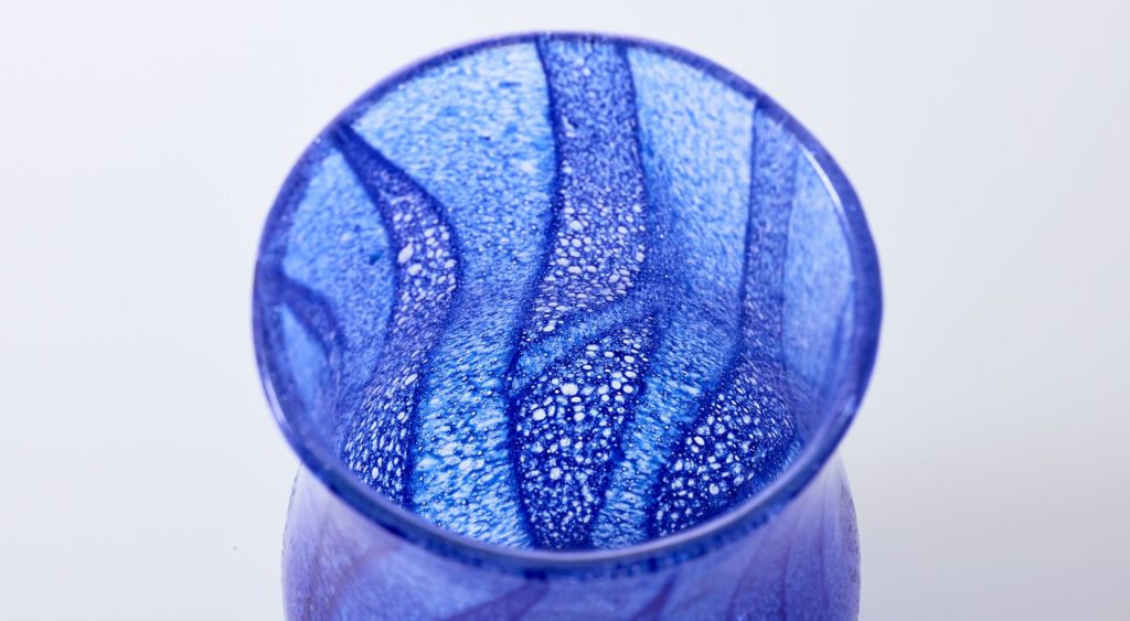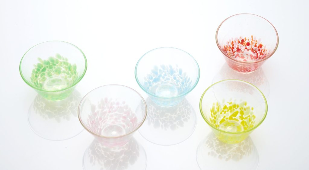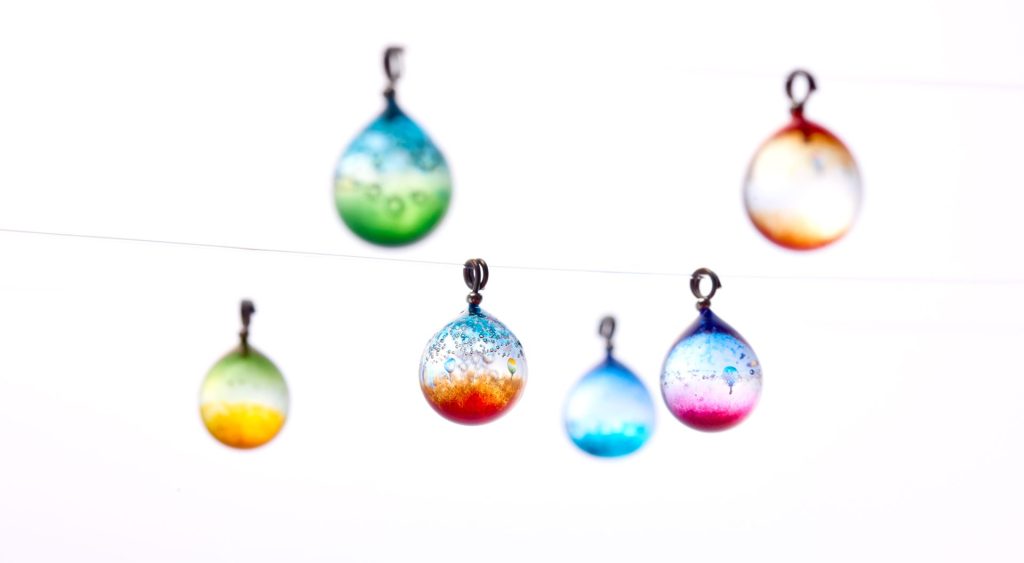 日の出から日没までの間に見られる、空と海の色の移ろいをグラデーションで表現しています。ガラス工房から見える朝焼けや夕焼けなど刻々と変化する美しい色合い、季節ごとの微妙な色変化を切り取り、上部と下部で異なる色彩を映し込みました。