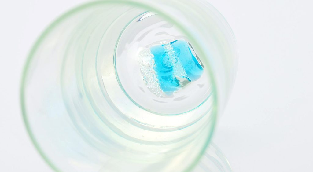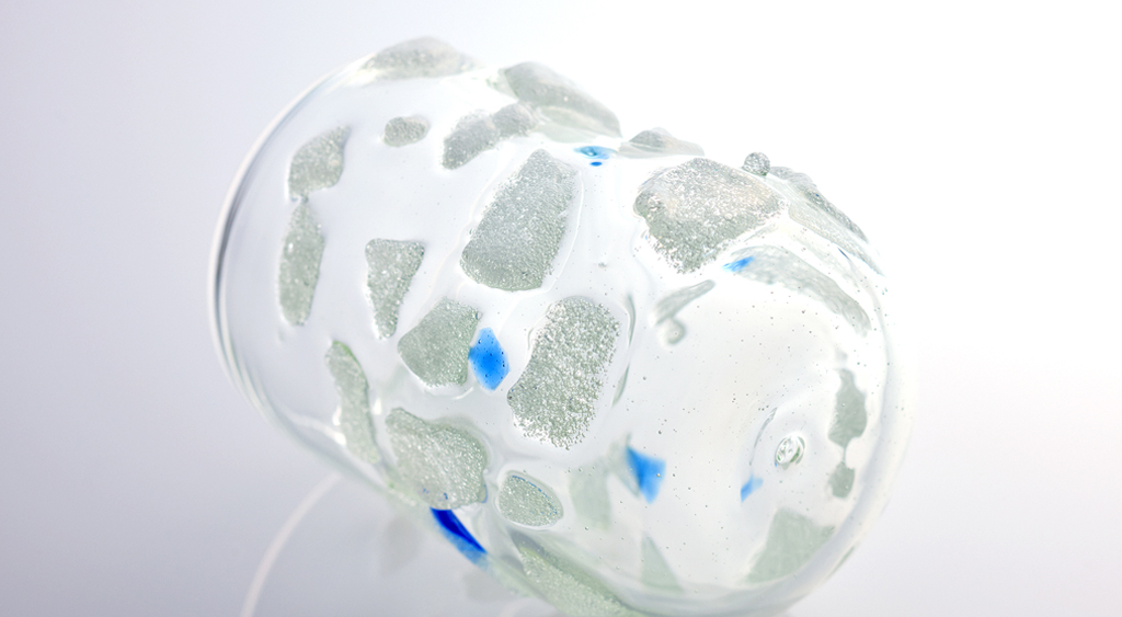 流氷が一面に広がる静かな冬の海の情景を再現しました。海原に広がる流氷には光の屈折により青く見える部分があり、一つだけ輝く宝石のような印象を与えます。透明なガラスに白い泡と水色のカケラを閉じ込め、そんな流氷の表情を表しています。